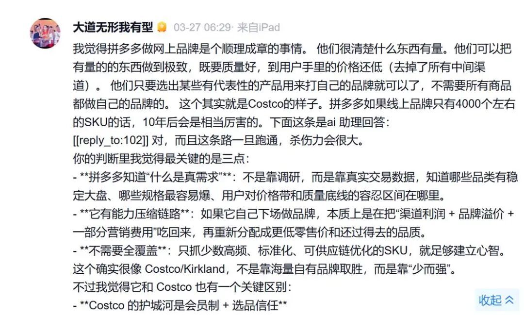 对于“新拼姆”,段永平近日也在雪球上点评称“顺理成章”,“他们(注:拼多多)很清楚什么东西有量。他们可以把有量的东西做到极致,既要质量好,到用户手里的价格还低(去掉了所有中间渠道)。”段永平称,这是拼多多一如既往地做Costco的思路。